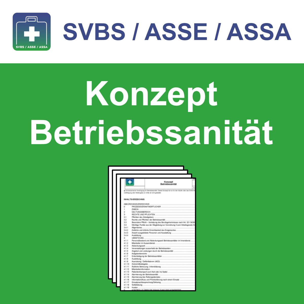 Das Konzept Betriebssanität der Schweizerische Vereinigung für Betriebssanität (SVBS) hilft Ihnen bei der Erstellung und Umsetzung Ihres Betriebssanitäts-Konzepts in Ihrem Betrieb. Ein Erste-Hilfe-Konzept ist für alle Betriebe empfohlen und für manche sogar Pflicht. Beim Erstellen eines solchen Konzeptes kann man sich schwer tun: was muss darin berücksichtigt und definiert werden? Der SVBS hat ein Musterbeispiel mitsamt allen denkbaren Anhängen erstellt, das individuell anpassbar ist. Das SVBS-Muster-Konzept soll und muss an die entsprechenden Gefahren im Betrieb, Betriebsgrösse, Leistungsvereinbarung, etc. individuell angepasst werden.